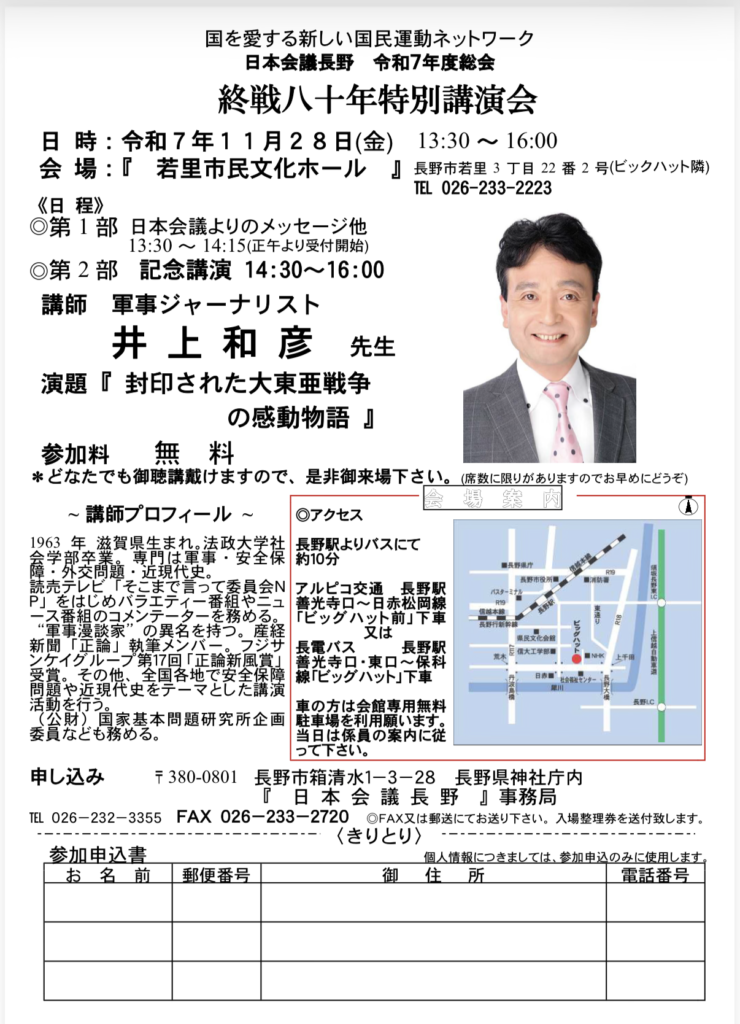 11月28日 日本会議長野 令和7年度総会と終戦八十年特別講演会が開催されました。